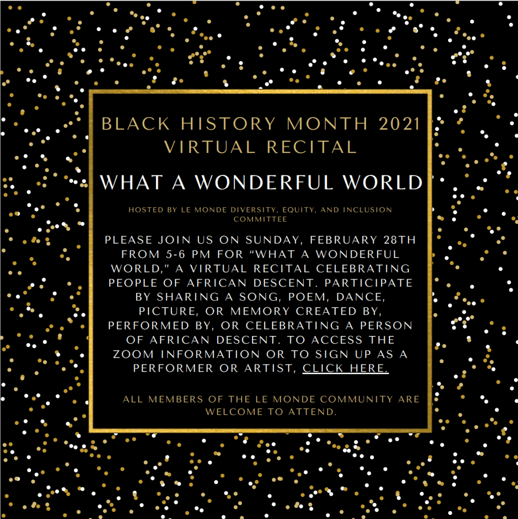 What a Wonderful World: Virtual Recital for Black History Posted on January 13, 2021February 16, 2021 by sebickerstaff Share this: Share on X (Opens in new window) X Share on Facebook (Opens in new window) Facebook Like Loading... Related